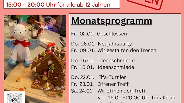 anbei unser >>>Monatsprogramm Januar<<<<<< für den Jugendtreff in Dassendorf.