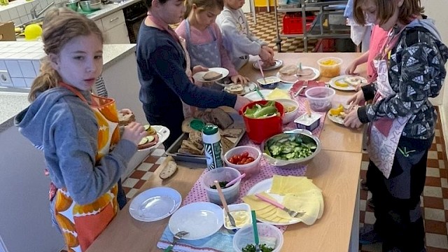 Ein besonderes Highlight bildete der große Kochtag zum Ende des Schulhalbjahres. Zwei Kochkurse wurden zusammengelegt und verwandelten die Küche in einen lebendigen Treffpunkt voller Düfte und fröhlicher Stimmen. Gemeinsam wurde ein großes, buntes Buffet für Smörrebrote vorbereitet: knackiges Gemüse, frische Salate, Rührei, Kräuter und gesundes Brot luden zum kreativen Belegen ein. Die Kinder probierten begeistert und waren sich einig: Es schmeckte einfach alles hervorragend.