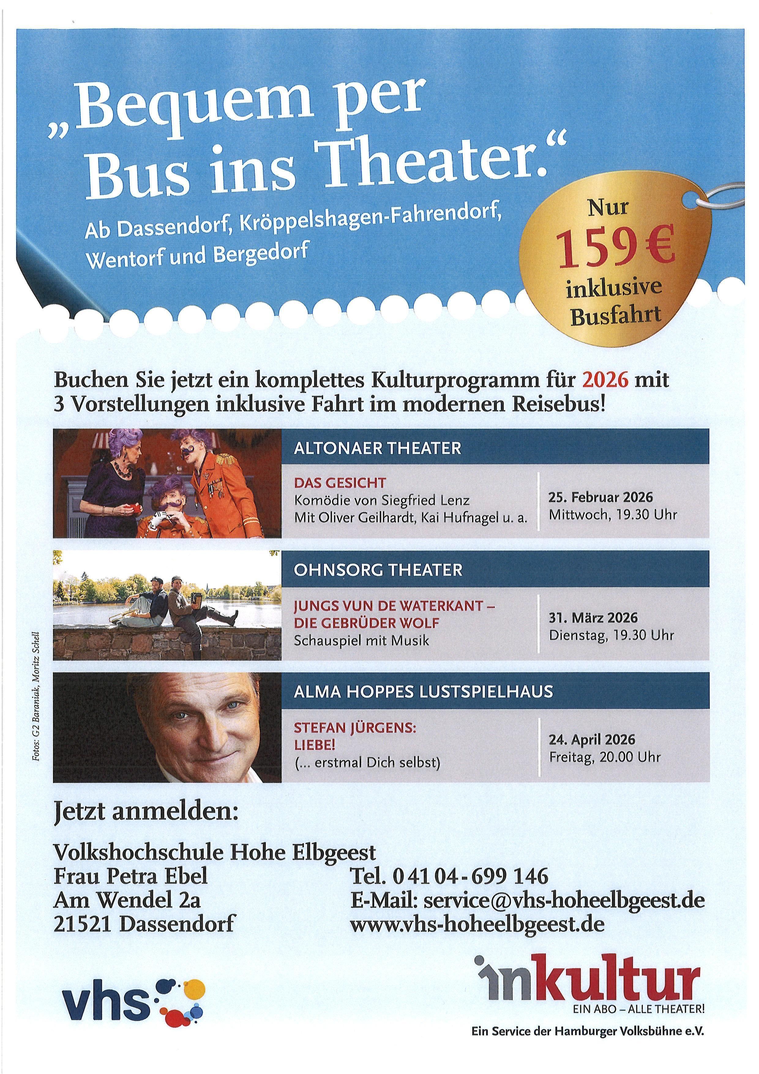 Die VHS Hohe Elbgeest war vor einigen Jahren einer der ersten Anbieter eines Theaterbusses, der kulturinteressierte Dassendorfer*innen und Gäste aus dem Umland in Zusammenarbeit mit InKultur aus Hamburg den komfortablen Theaterbesuch in der Hansestadt mit Busanreise ermöglicht.