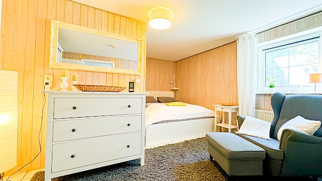 - Schlafzimmer mit komfortablem Doppelbett und großzügigem Kleiderschrank.