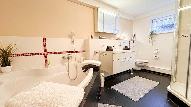 - Badezimmer mit großer Badewanne & Handtüchern – perfekt zum Entspannen.